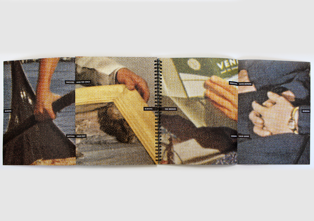 Long Story Short was published in 1999, though the book was conceived and put together during a month-long residency at Yaddo Artists' Colony in Saratoga Springs, NY, in the Spring of 1997. The book is semi-autobiographical. It uses images of hands as a connecting motif throughout the book. I have alwys found hands to be particularly expressive. For some time, I had had the idea of taking on the challenge of trying to tell a story through the use of aphorisms or truisms. The collection, editing and positioning of these little cliches so that they told a narrative story took a great deal of time yet was fun in the way that a puzzle is fun.
