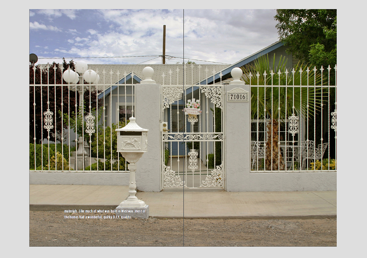 Though these were not wealthy folks (there are almost no paved roads in Westway) they took great pride in their homes. But why were such extensive and often elaborate fence and wall systems built? Is it because they stood for strength, law and order, security…were they reassuring? Was there a clear danger from neighbors or outsiders to themselves and their property? I looked up police blotter reports for the area and there did not seem to be much crime at all, certainly not any more significant violence or theft than in any other nearby community.