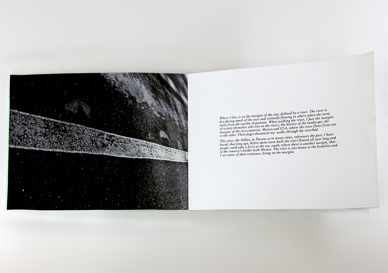 Karen made this book in a small edition of seven, printed in archival inkjet and letterpress. She writes: "Who owns water? Most states in the USA claim that the people have the right to water. I can't imagine anything other than everyone having a right to free water, but its not the case. The right to water was an idea that I was thinking about when developing in this book. “First user in time, first right” but where is the democracy? The diversions and claiming of water has had a profound change in the landscape. The access to water, I believe, has defined the landscape and the society. This book is about my experience living on the margin of the city, defined by a river. The river is dry during much of the year and violently flowing in others when the snow melts from the nearby mountains. Hundreds of years ago, before the dams, the river ran all year long. There are three themes that flow in the book, the margins of society (homeless who live in the river), the history of the damming of the rivers that feed into mine and subsequent natural changes, and margins of two countries, Mexico and USA, where the river flows from one to the other. The book documents my walks through the riverbed. The book is primarily photographic with some text and letterpress images. There are two phrases in the book about water rights. Additionally, there are some graphic images that eludes to the flow of water and people."