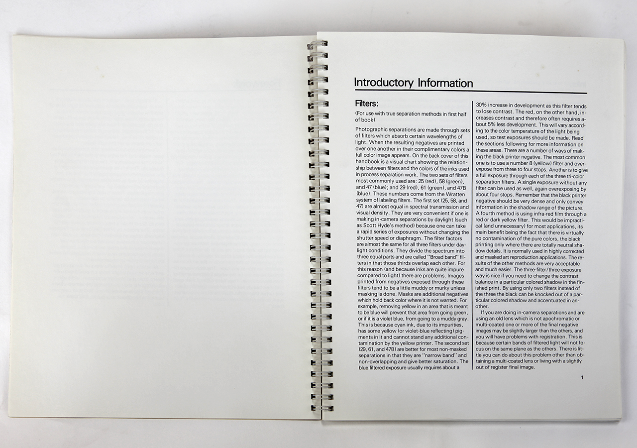 This book was originally conceived to address the problem that many artists had in the seventies and early eighties of obtaining four-color CMYK separations. Separation film sets were expensive to buy and very difficult to make yourself without expensive equipment and a lot of technical experience and training. I had been learning to make color separations and printing them by offset lithography and various non-silver processes. The need for technical help for artists was there. I decided to put together a how-to manual for artist printmakers and photographers working in many types of media. I asked about a dozen artist friends whom I knew who were working in a variety of separation methods and media to contribute to the book. I wrote the introduction and contributed a chapter of my own on two color separations using complimentary pairs.