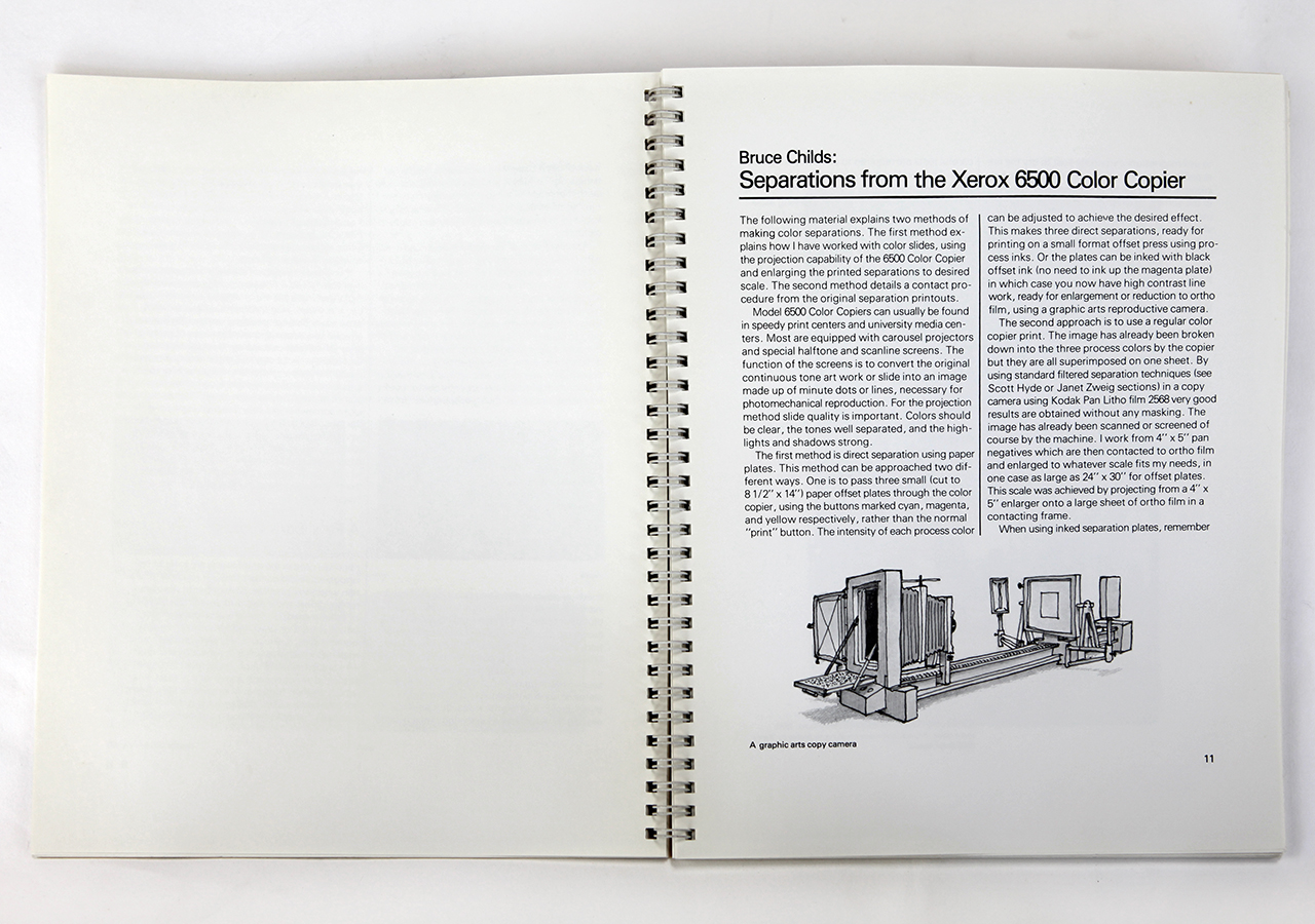 This book is formatted like a cook-book with a lay-flat spiral binding so that it would be easy to use in the darkroom. It was widely used by many around the world to make inexpensive non-traditional color separations and sold out within a couple of years. It should be remembered that this was written before the use of personal computers or Adobe Photoshop. In the Spring of 2009, JAB, The Journal of Artists' Books, issued a special issue, No. 25, on offset printing. Two sections in that issue centered on the historical importance of Options for Color Separation to the artists' book field. The first section was called I (heart) DIY CMYK and was written by Pattie Belle Hastings. The second section was written by Clifton Meador and was called Afterword. For most this book has out-lived it's usefullness since the advent of Photoshop in the late eighties made making a separation as easy as pressing the command-p key on a keyboard. Things were not always that easy!