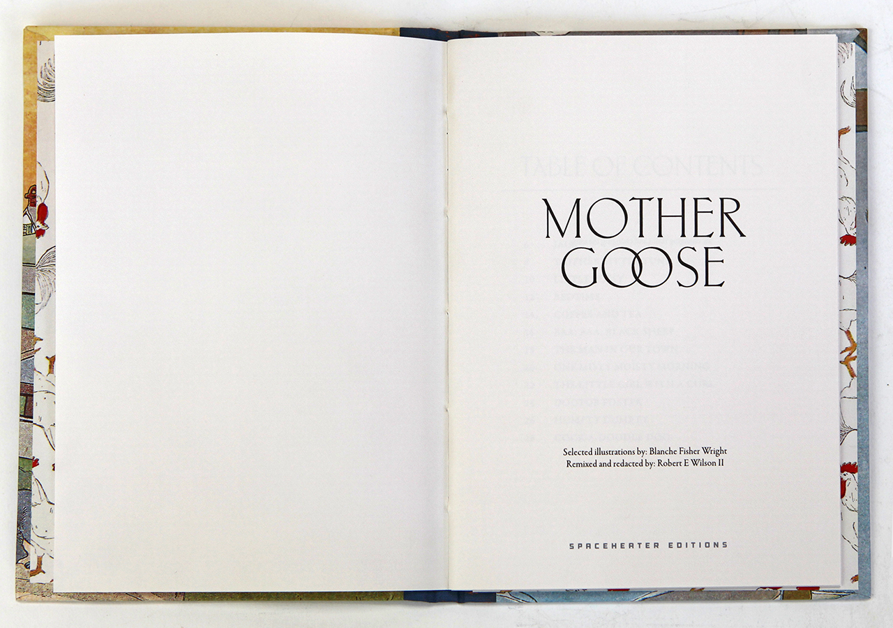 Rob Wilson's amusing Redacted Mother Goose uses the old children's favorite storybook Mother Goose to tell a sly new story by changing the original poems and illustrations. Blanche Fisher Wright created the iconic public-domain images in 1916. As the dedication mentions at the beginning of the book, "for changing times and changing meaning".